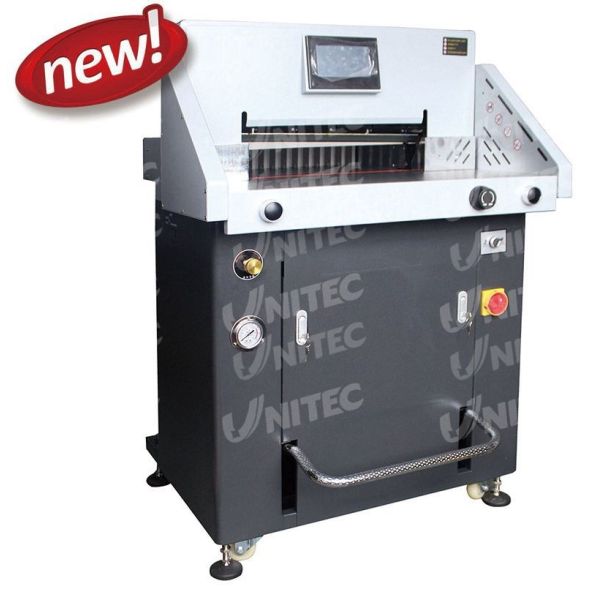 H720R is a hydraulic programmed guillotine that can set 100 programs, each program can set 21 cuts, it is for cutting paper sheets, books and photo albums.